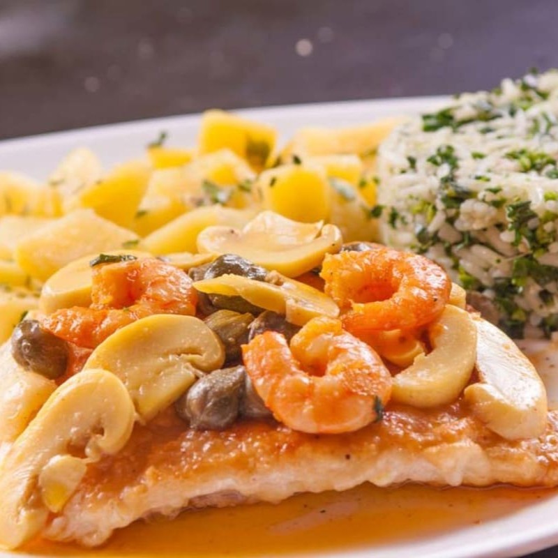Filé De Peixe Ao Molho De Alcaparras E Camarões Acompanhado De Salada E Arroz