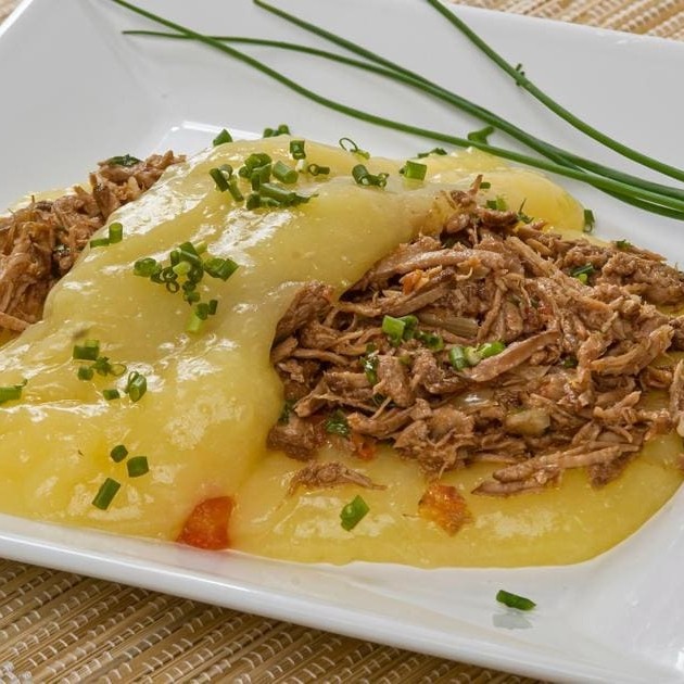 Deliciosa Carne de Sol acebolada com aipim e baião de dois