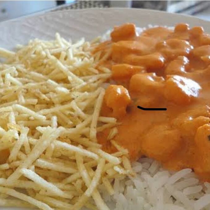 Estrogonofe de camarão + arroz + batata palha