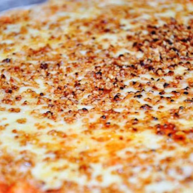 Molho de tomate, mussarela, e alho frito.