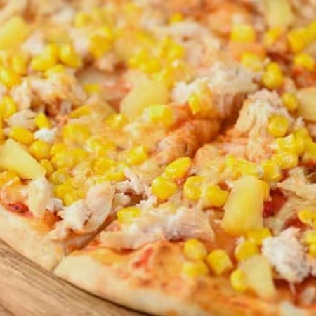 Molho de tomate, mussarela , frango , milho.