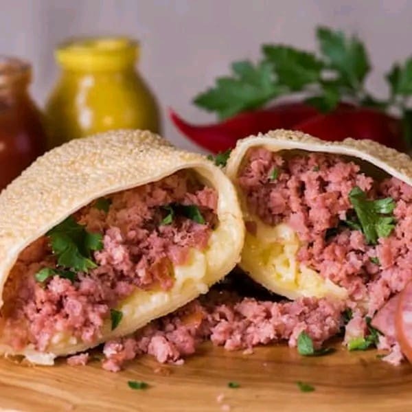 Um crocante e saboroso pastel recheado de Carne Moida, Azeitona e Cebola. Nossa massa é de 22cm.