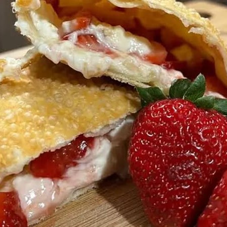 Um crocante e saboroso pastel recheado de chocolate branco e morango. Nossa massa pastel doce é de 15cm.