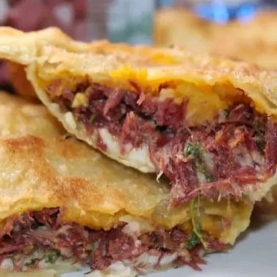 Um crocante e saboroso pastel recheado de carne seca com queijo. Nossa massa é de 22cm.