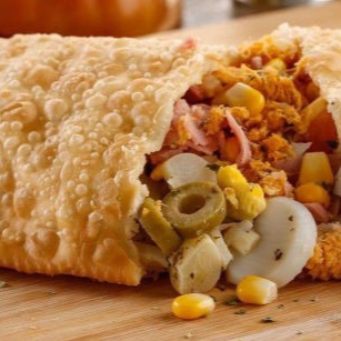 Um crocante e saboroso pastel recheado com Frango Desfiado, Milho e Cream Cheese. Nossa massa é de 22cm.
