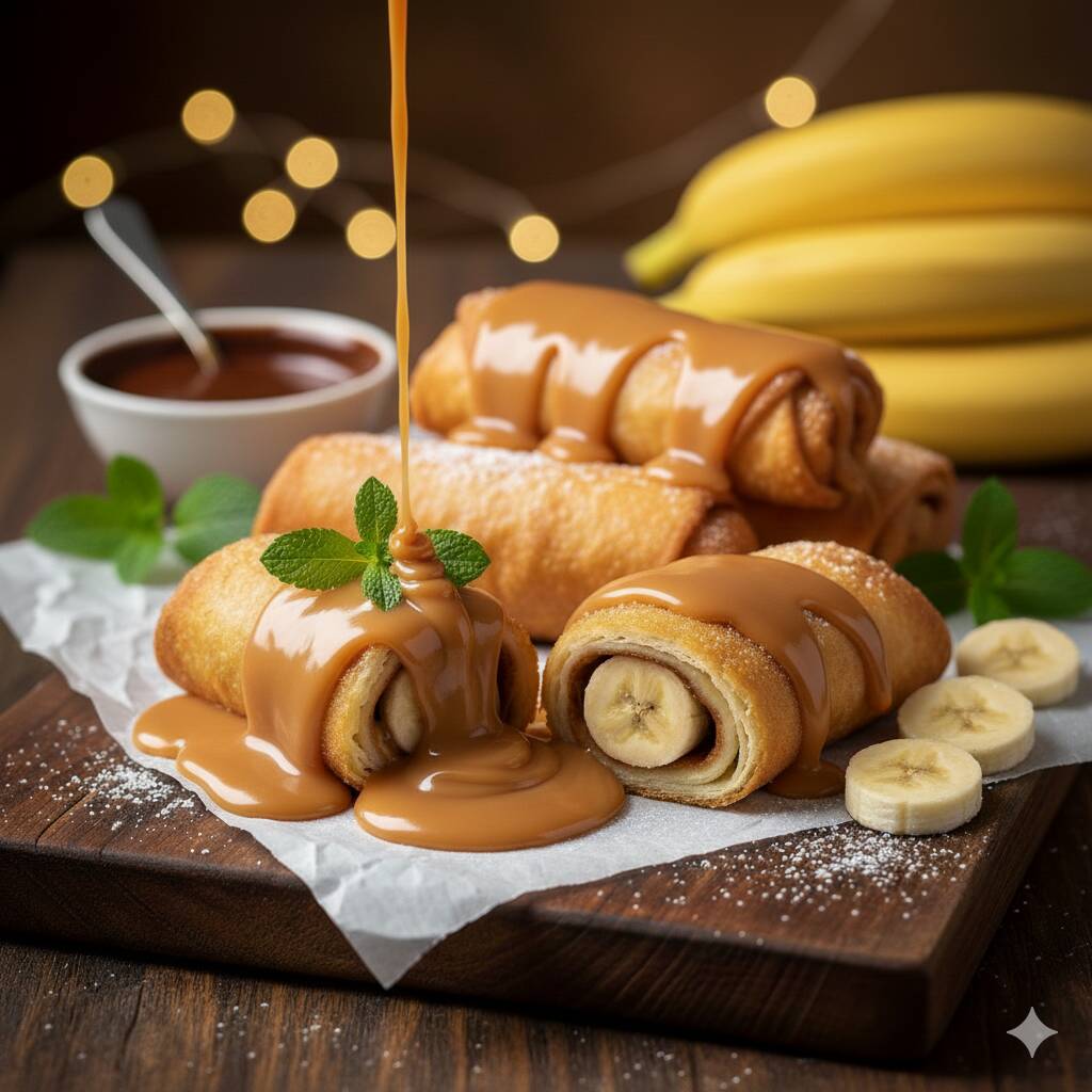 Rolls de Banana com doce de leite. Descubra a perfeição em um snack! Nossos Rolls são rolinhos de massa pastel crocante, generosamente recheados com banana com doce de leite. Ideal para compartilhar ou saborear sozinho! Escolha o tamanho do seu Rolls: 15cm ou 22cm