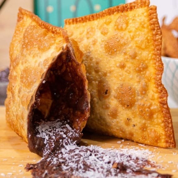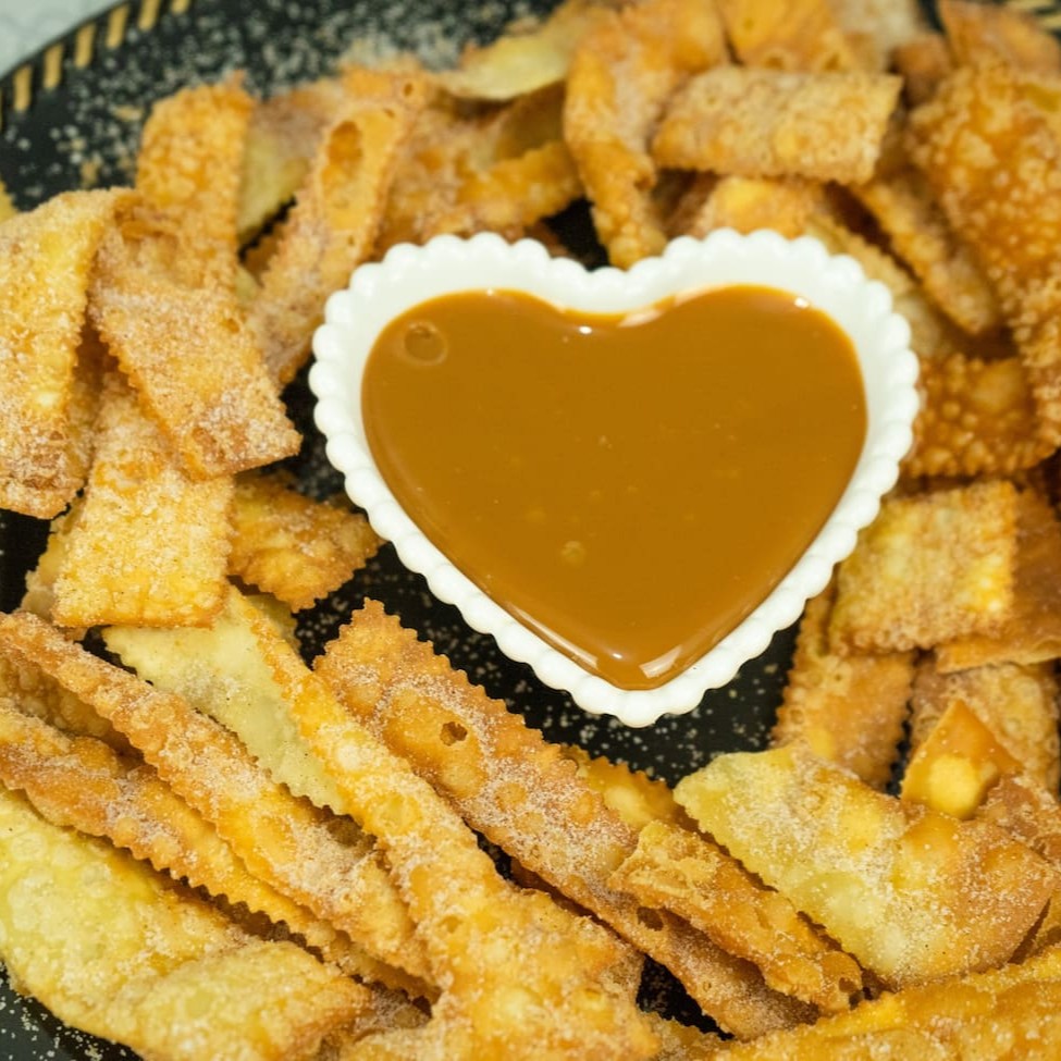 Deliciosas tirinhas e palitos de massa crocante adocicadas com açúcar e canela, que vão acompanhadas de um potinho de sabor a sua escolha (doce de leite ou brigadeiro de chocolate 50% cacau).
