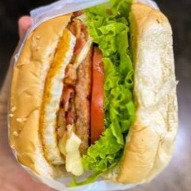 Pão,carne,queijo,ovo,cheddar,batata palha e salada(Tomate,Cebola E Alface)