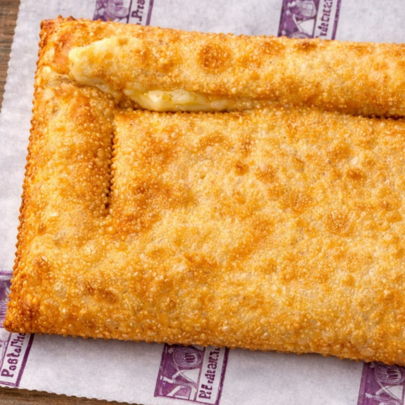 Pastel crocante recheado com muita mistura de quatro queijos derretidos e catupiry cremoso, com borda recheada de queijo mussarela