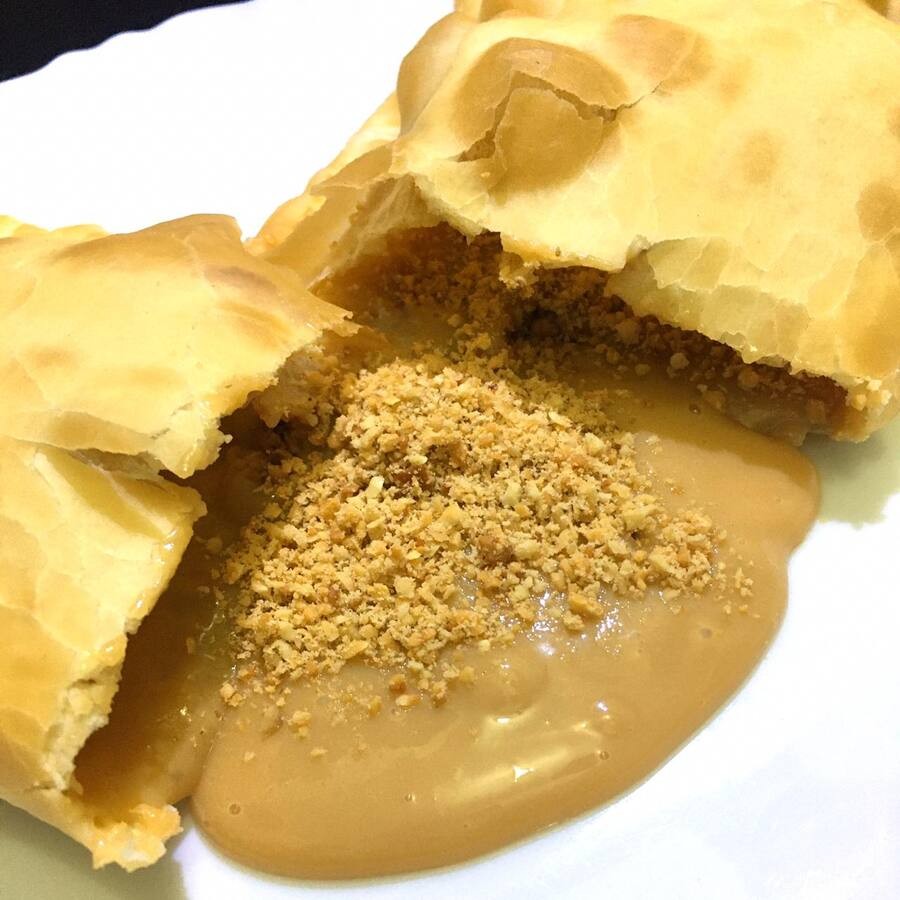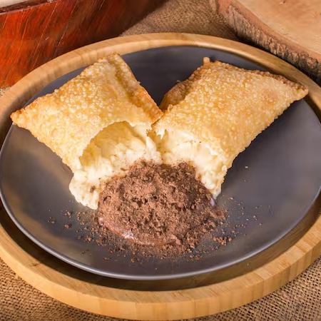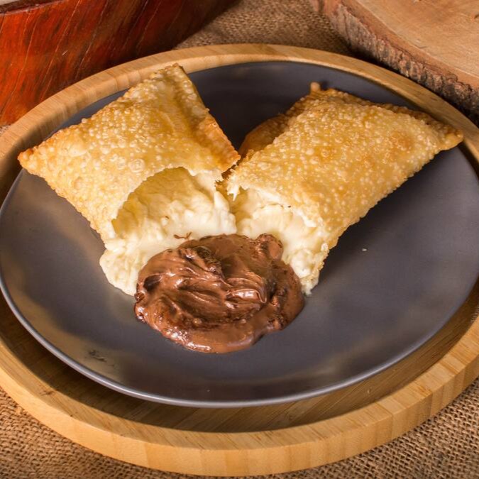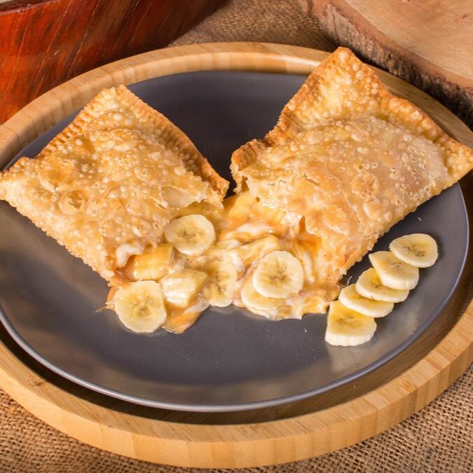 Delicie-se com um pastel de 22 cm recheado com banana em rodelas, chocolate branco cremoso, doce de leite caseiro (Leite Moça), açúcar e canela. Uma explosão doce e envolvente que derrete na boca! Crocante por fora, irresistivelmente cremoso por dentro.