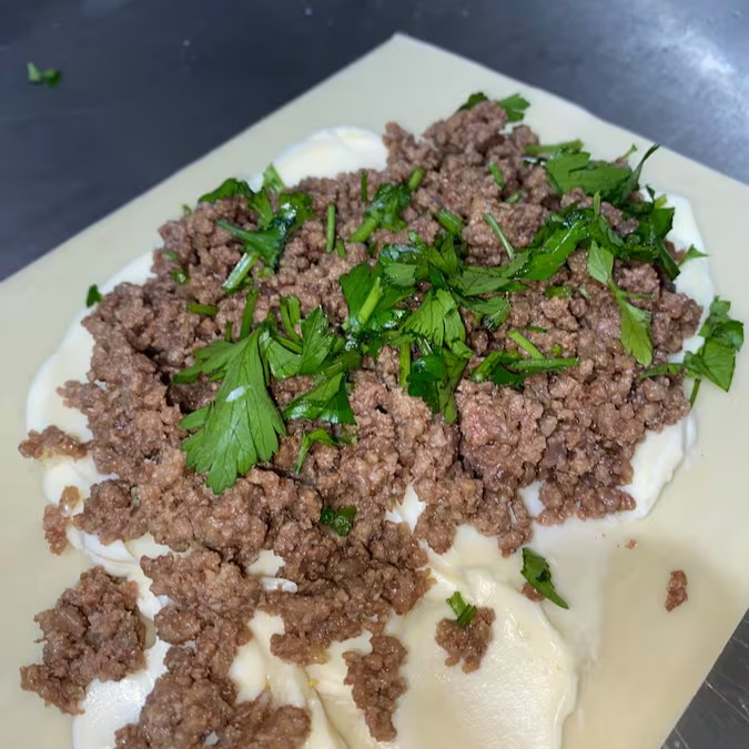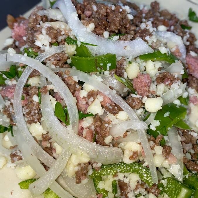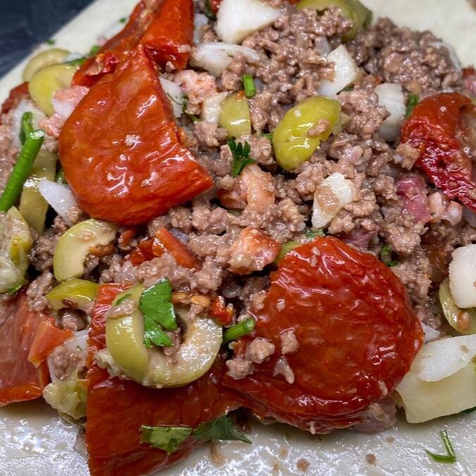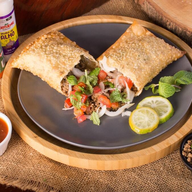 Pastel de 22cm com carne moída temperada, cebola, tomate, hortelã fresca e um toque de limão e pimenta-do-reino. Sabor marcante, leve e refrescante!