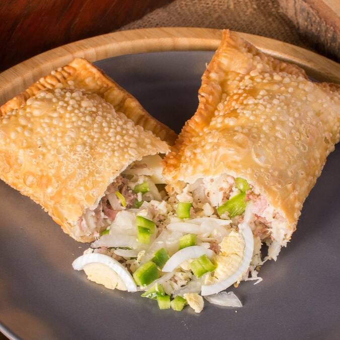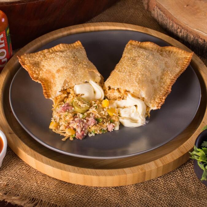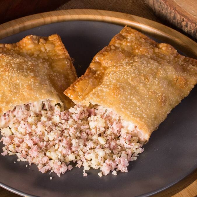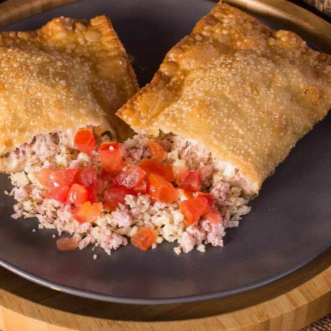 Pastel de 22cm recheado com presunto e calabresa triturados, queijo muçarela, ovo, cebola, pimentão e orégano. Um clássico sabor português em versão crocante!