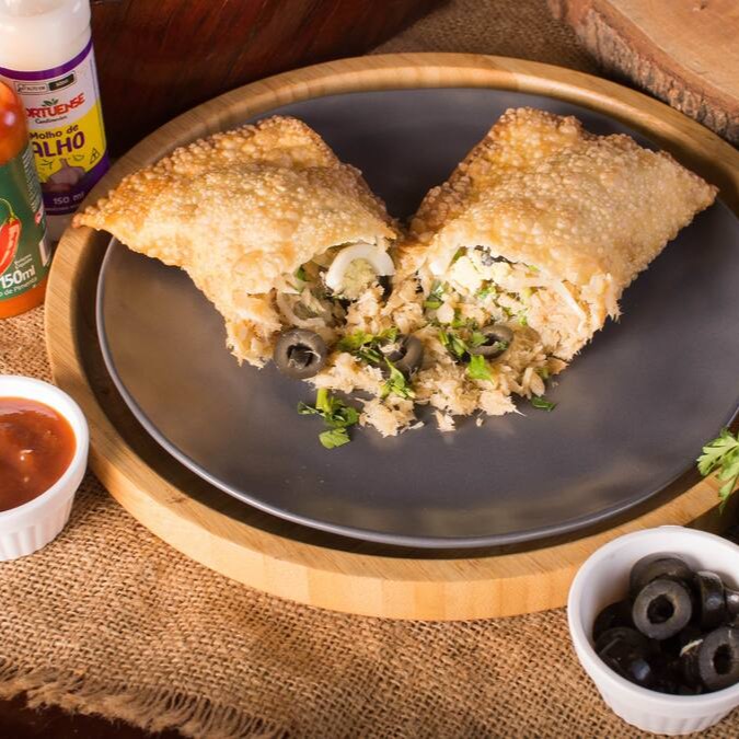 Pastel de 22 cm recheado com bacalhau desfiado, refogado no azeite com alho dourado, cebola em rodelas, azeitona preta e pedaços de ovo cozido. Uma combinação rica, suculenta e cheia de tradição portuguesa, perfeita para quem ama sabores autênticos.