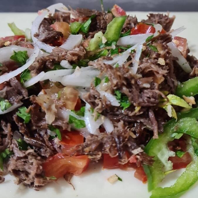 Pastel de 22 centímetros de carne seca desfiada e refogada no alho e cebola com queijo muçarela e salsa.