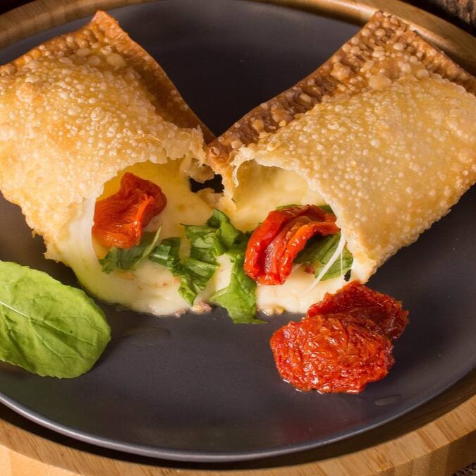 Pastel de 22cm recheado com queijo muçarela derretido, rúcula fresquinha e tomate seco. Uma combinação leve, sofisticada e cheia de sabor para quem ama um toque especial!