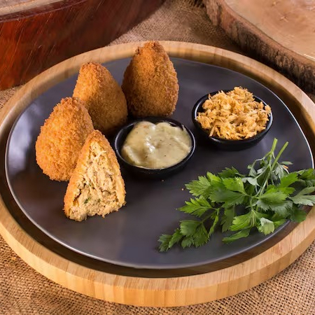 Porção com 4 unidades de coxinha de frango desfiado, sem massa, super suculenta e crocante. Acompanha molho especial. (Crocância pode ser comprometida no delivery) Serve 2 pessoas