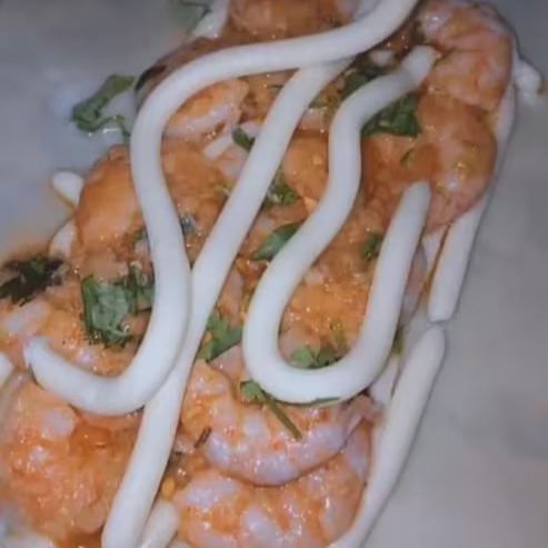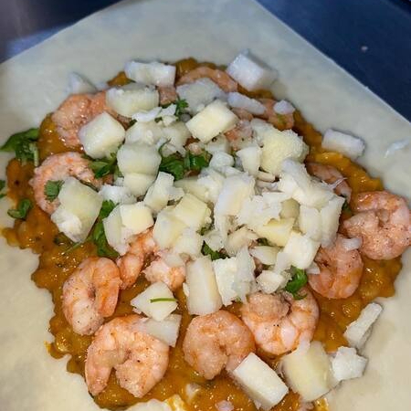 Pastel de 22 centímetros com 12 camarões inteiros refogados no alho com molho de camarão, queijo muçarelal e coentro. Serve 1 pessoa