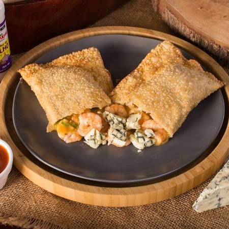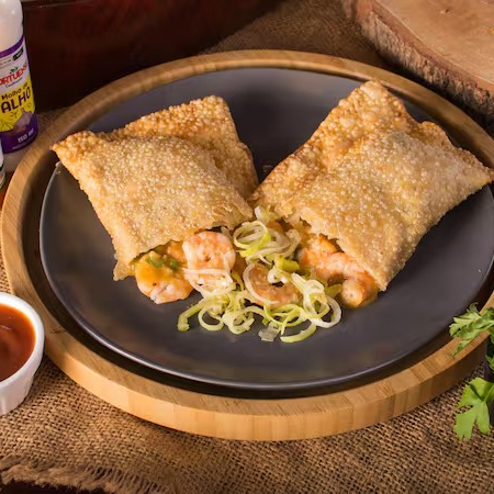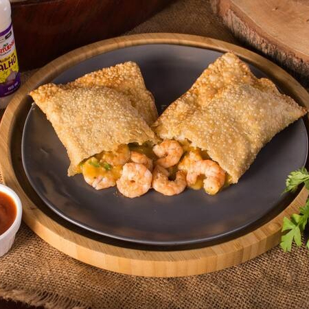 Pastel de 22 centímetros com 12 camarões inteiros refogados no alho com molho de camarão e coentro, Catupiry Original e queijo gorgonzola. Serve 1 pessoa