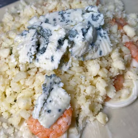Pastel de 22 centímetros com 12 camarões inteiros refogados no alho com molho de camarão e coentro, Catupiry Oficial, queijo muçarela, queijo provolone e queijo gorgonzola. Serve 1 pessoa