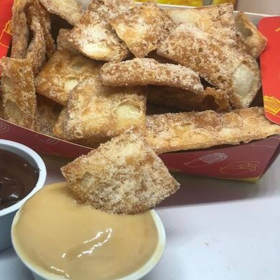 Quadradinhos de massa de pastel crocante, polvilhados com açúcar e canela (opcional), acompanhados de um pote de molho doce à sua escolha. Um petisco leve, doce e irresistível!