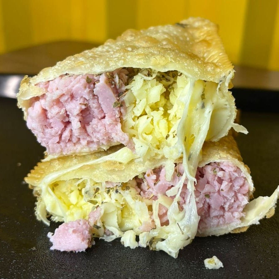 Muçarela derretida e presunto selecionado, temperado com orégano. Uma combinação clássica que nunca sai de moda. Nossos pastéis possuem 20 cm, com recheio do início ao fim.