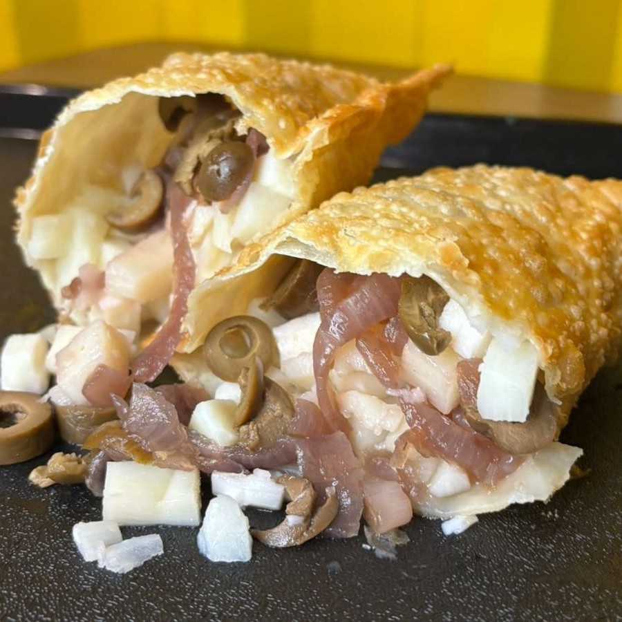Palmito fresco e suculento com cebola roxa caramelizada e azeitonas pretas, criando uma combinação irresistível e totalmente vegana para quem busca sabor e leveza. Nossos pastéis possuem 20 cm, com recheio do início ao fim.