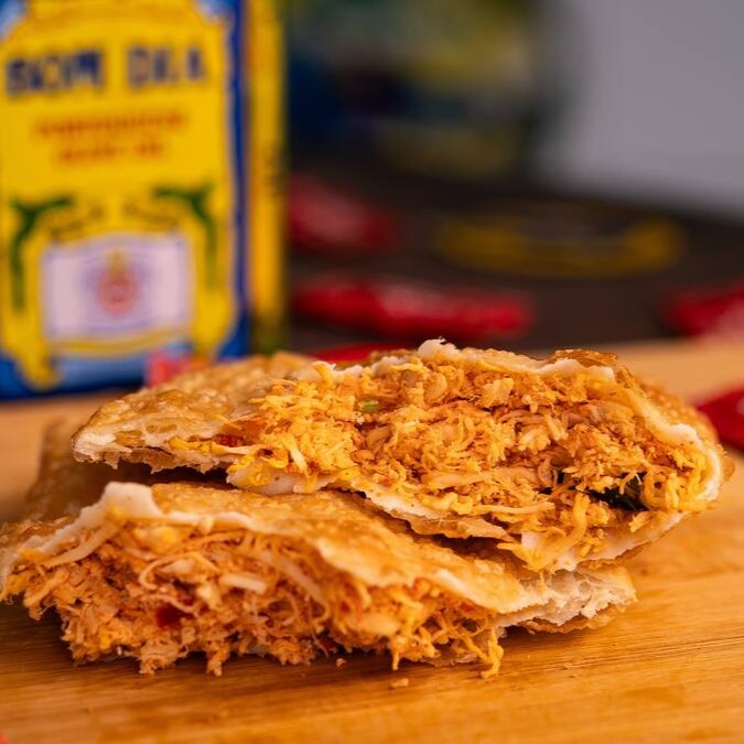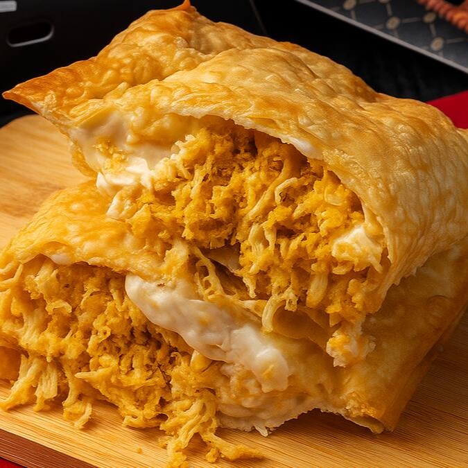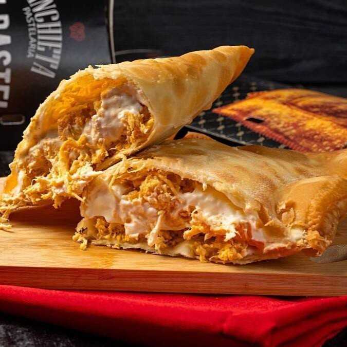 Recheado com frango desfiado macio e saboroso, dentro de uma massa sequinha e crocante.