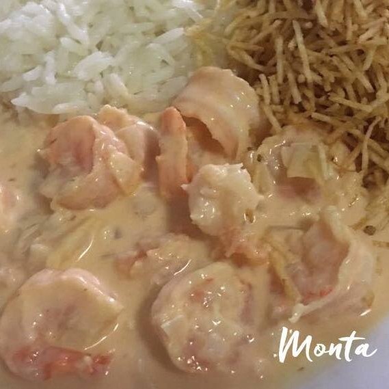 Nossa Deliciosa Batata Receada no pote de 500 gramas, de Estrogonoff de Camarão com Bacon e salsa