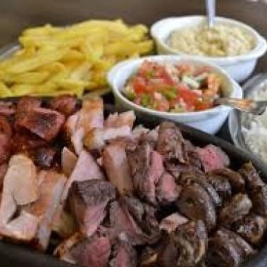 Um delicioso Churrasco Misto de 500 gramas com (125g de Carne, 125g de linguiça, 125g de frango e 125g de picanha suína) + arroz + farofa + batata frita + 1 Guaraná de 1 litro