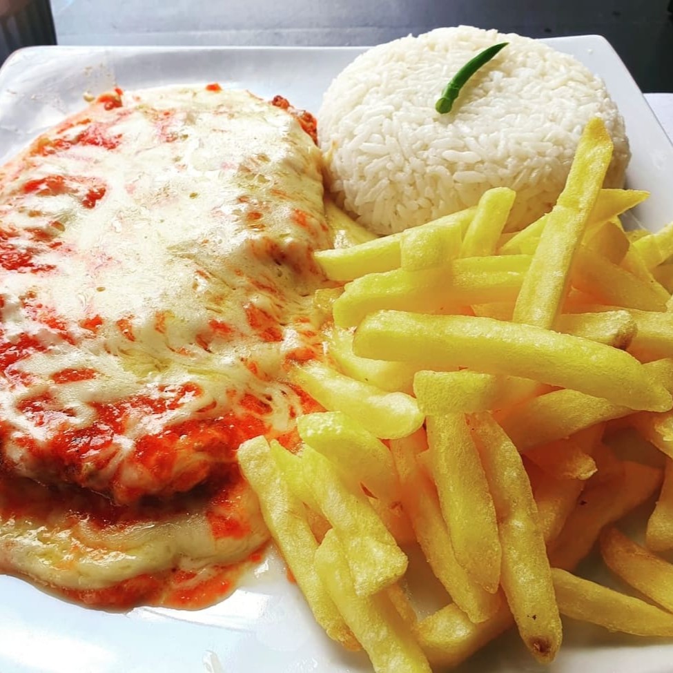 Um delicioso Filé de Frango á Parmegiana , com um feijão bem temperado, Arroz branquinho e farofa batata frita
