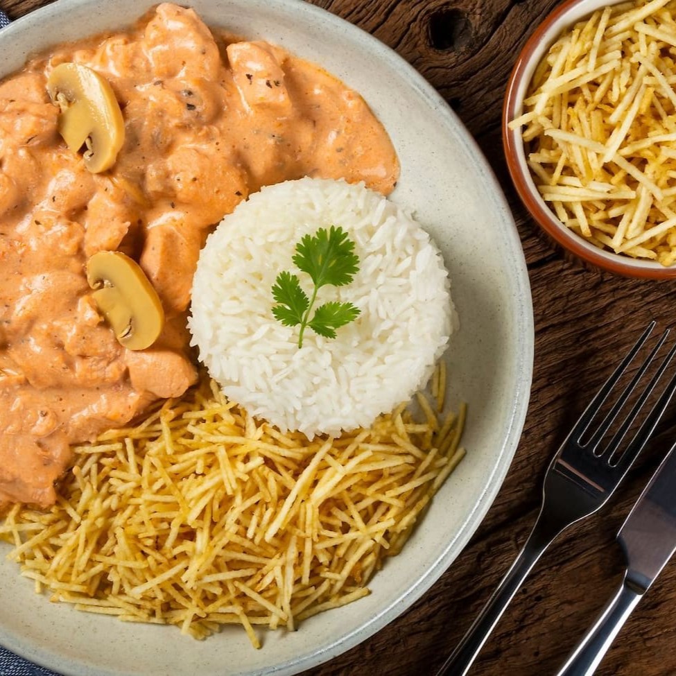 Um delicioso Filé de Frango Grelhado, com um feijão bem temperado, Arroz branquinho e farofa com Batata Frita