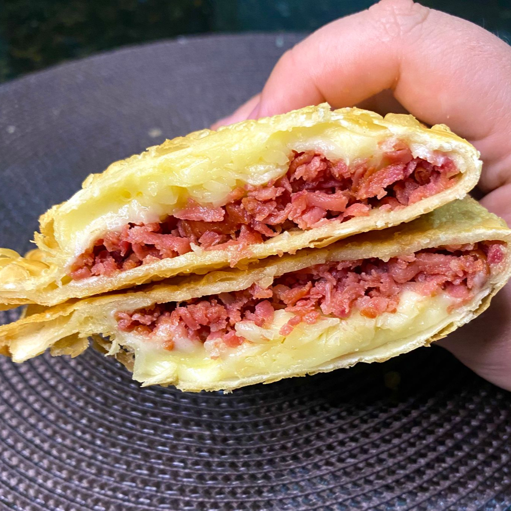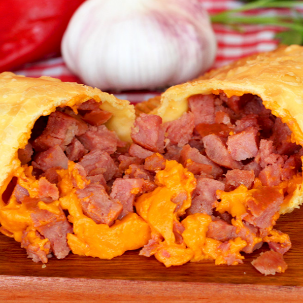 Pastel de 21cm recheado com a dupla clássica que nunca sai de moda: presunto saboroso e queijo derretido. Sempre sequinho, crocante e bem quentinho, é a escolha certa para quem busca um pastel tradicional, bem recheado e cheio de sabor.