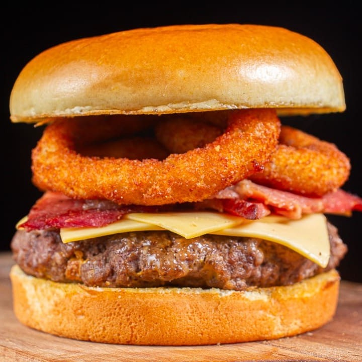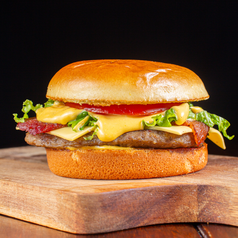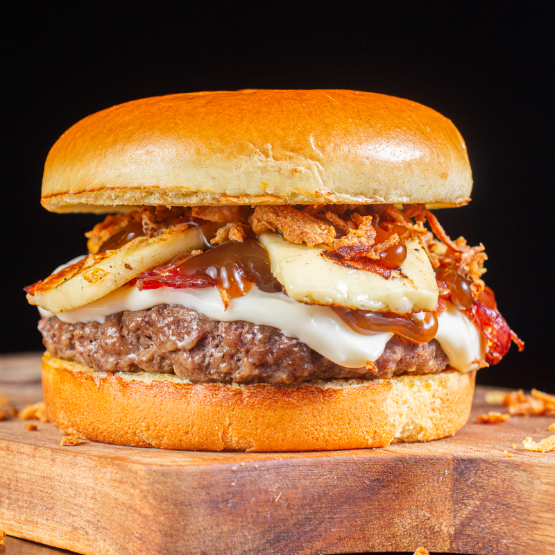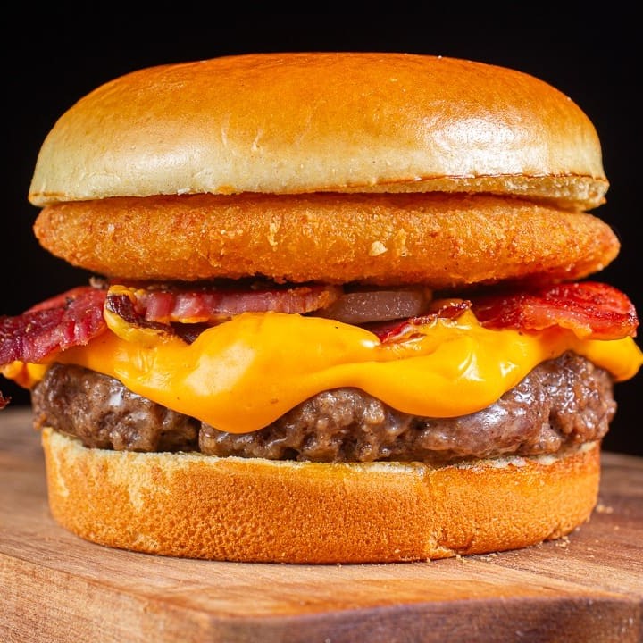 Pão brioche, blend 120g, queijo prato, bacon e anéis de cebola.