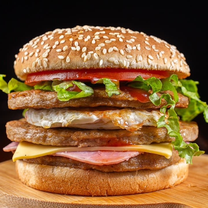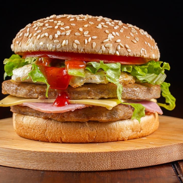 Pão gergelim, 3 hambúrgueres, ovo, queijo, presunto, salada e ketchup.