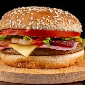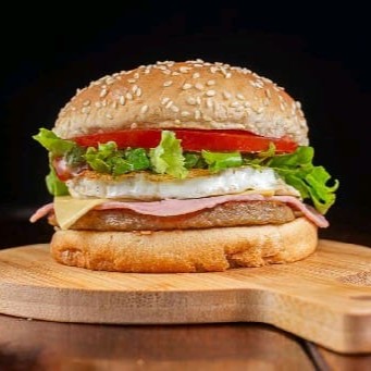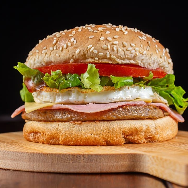 Pão gergelim, hambúrguer, queijo, presunto, bacon , salada e molho.
