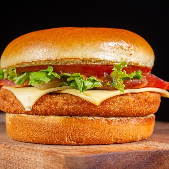 Pão brioche,chickem empanado, bacon, queijo prato, alface tomate e molho.