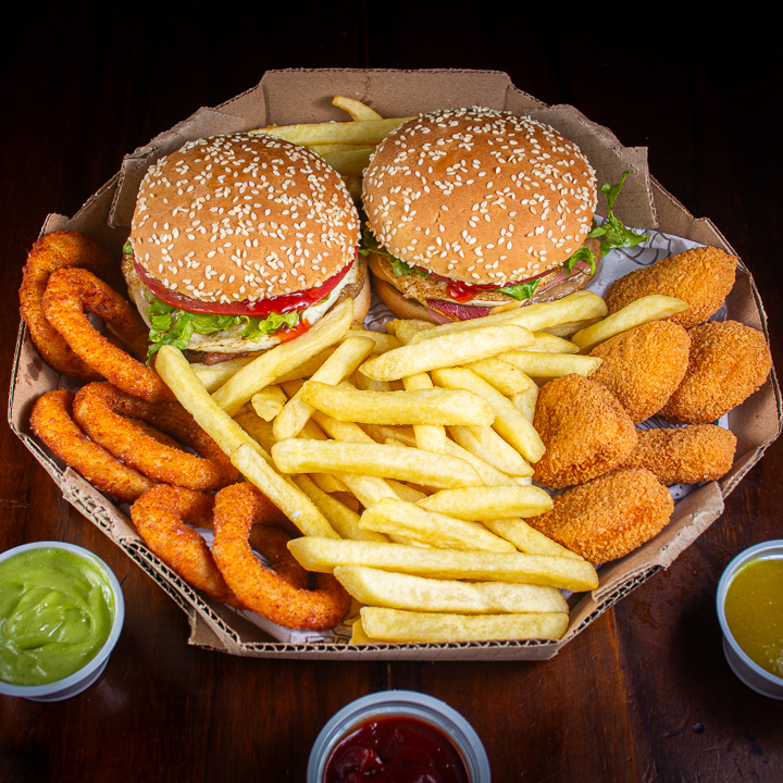 2 Xtudos, 6 nuggets, batata frita, 6 anéis de cebola e 1 Guarana antártica 1L..