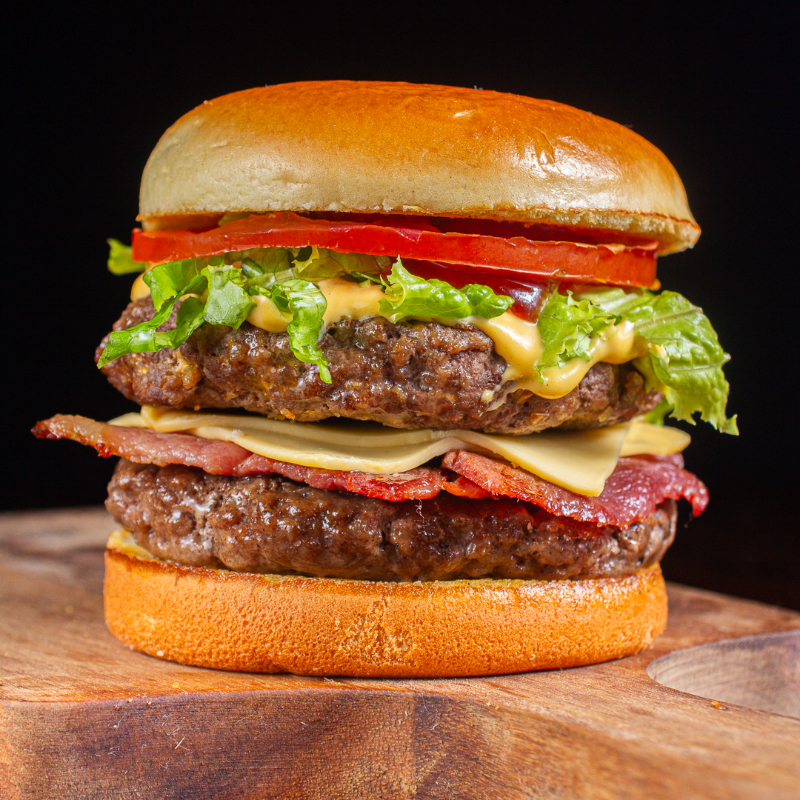 Pão brioche, 2 blends de 120g cada, bacon, queijo, alface, tomate e molho especial.
