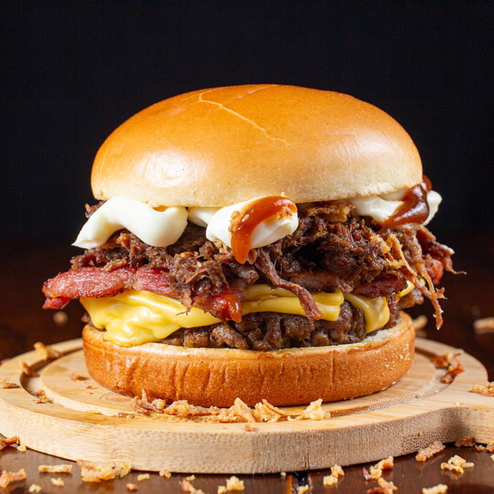 Pão brioche, blend120g, costela bovina, queijo, bacon, catupiry, barbecue e cebola crispy