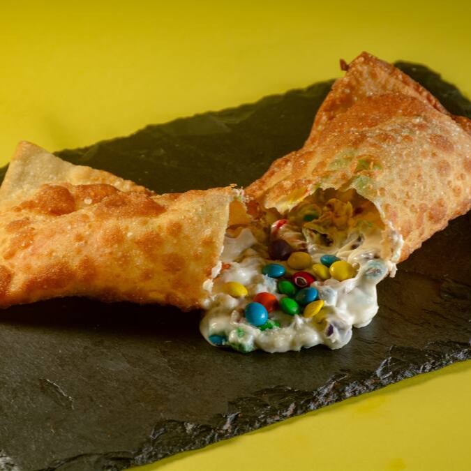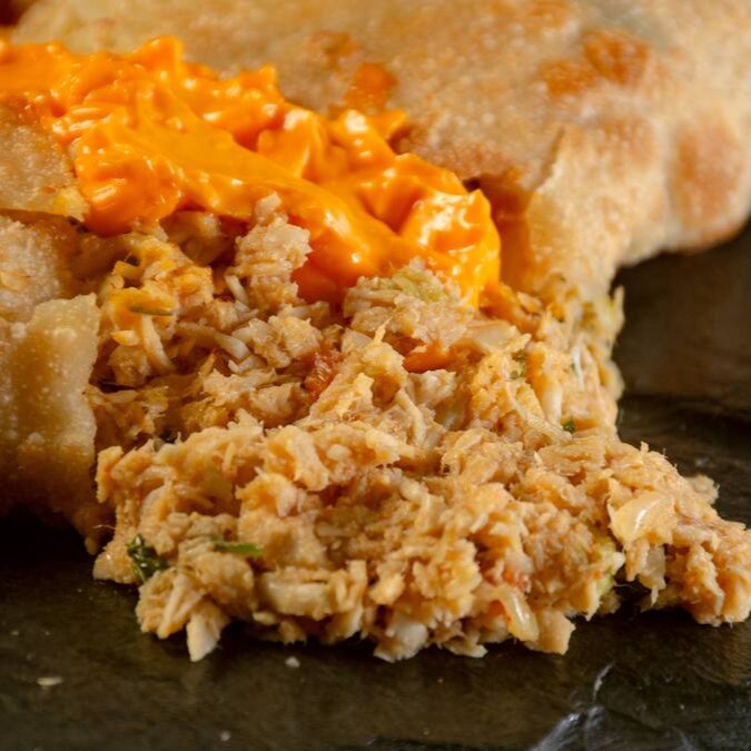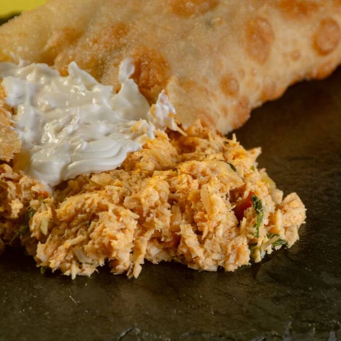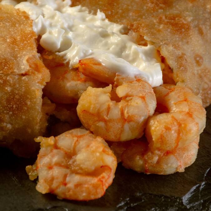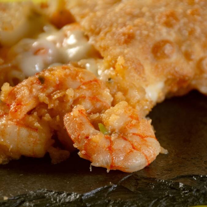 Pastel 22cm com nosso camarão premium, Catupiry e finalizado com salsa fresca