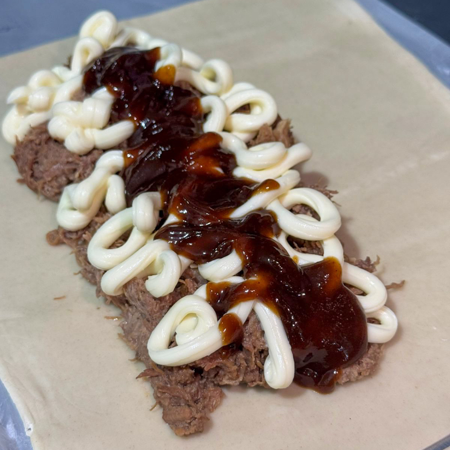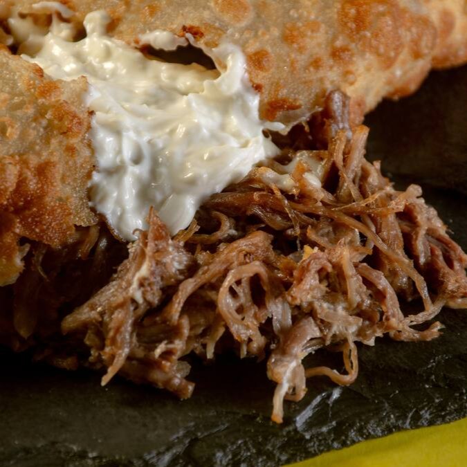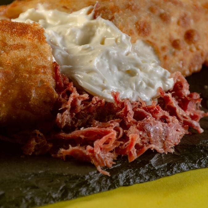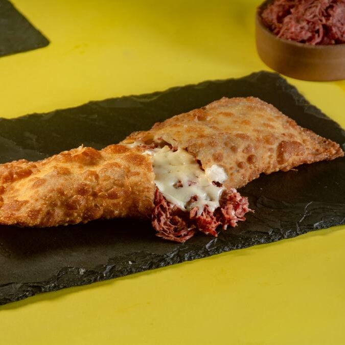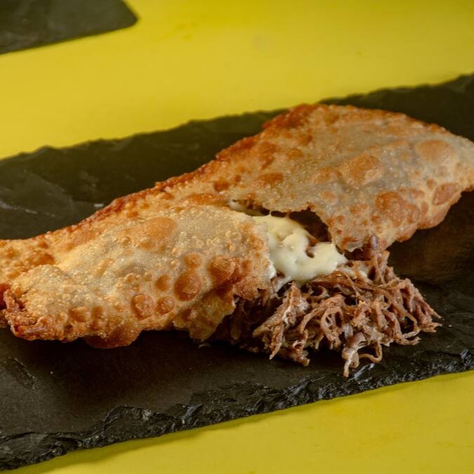 Pastel de costela bovina desfiada, barbecue defumado e catupiry original