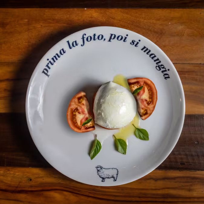 A verdadeira mussarela de búfala com tomates, azeite virgem e manjericão