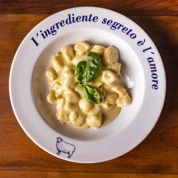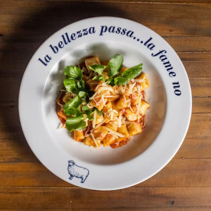 Nhoque caseiro com molho de tomates, rúcula e parmesão.