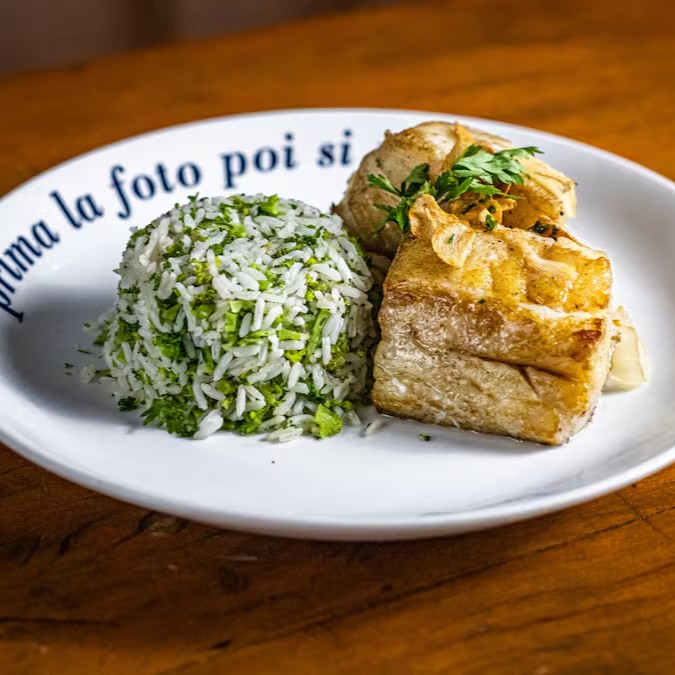 Posta de bacalhau frita com cebolas caramelizadas e alho crocante, acompanhado de arroz de brócolis