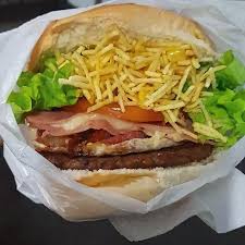 Pão, 3 carnes, 3 fatias de cheddar, salada e batata palha