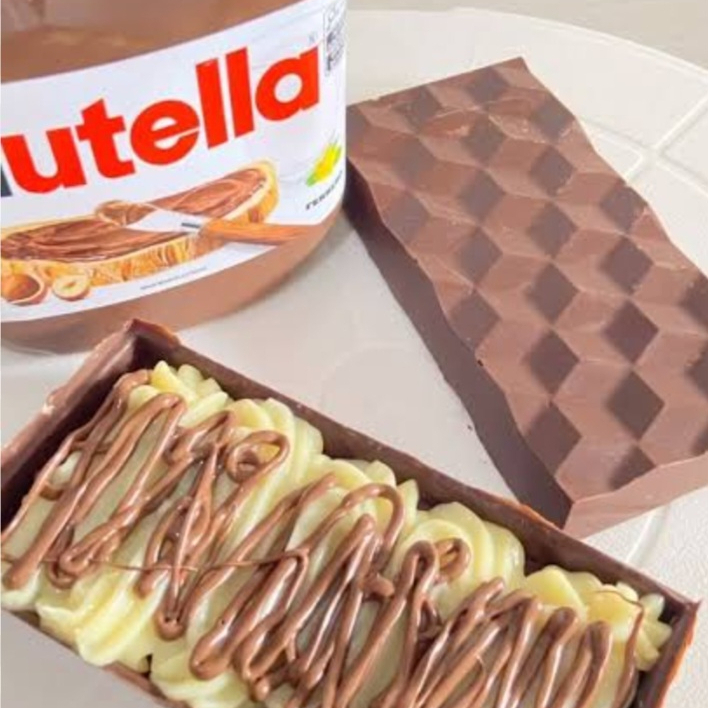 Feito com chocolate meio amargo e recheada com creme de ninho e nutella