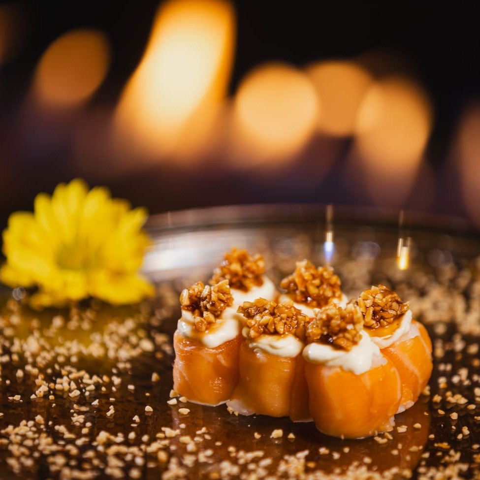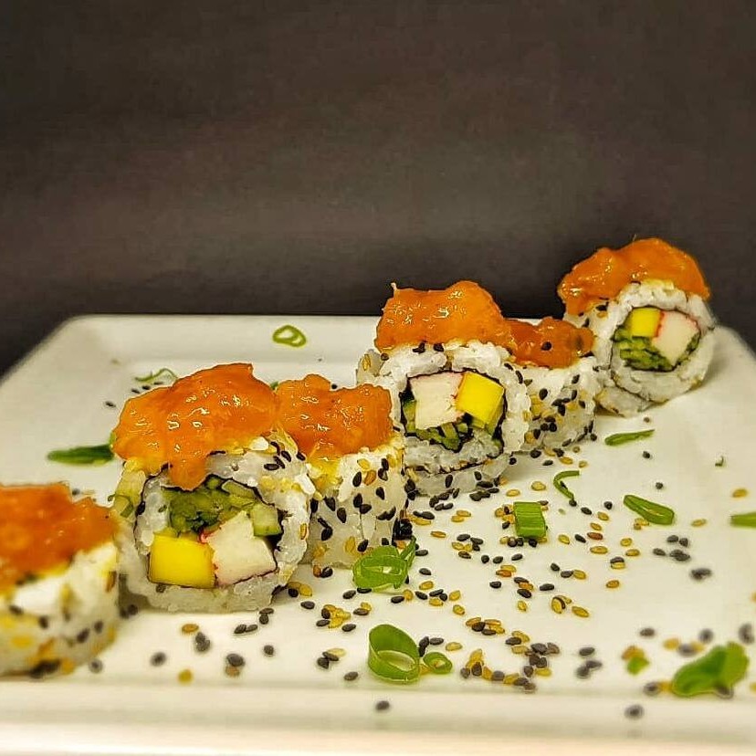 Aquele tradicional Hot irresistível, ainda mais crocante , preparado na farinha panko, com tartare de salmão e aquele toque de pimenta siriracha