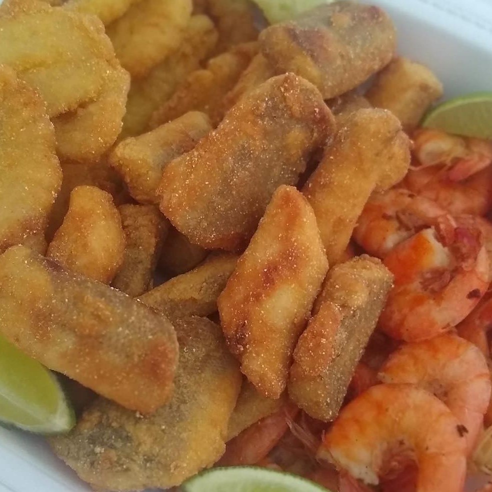 Compostos e isca de peixe sem espinha, camarão frito e batata frita, a combinação perfeita.