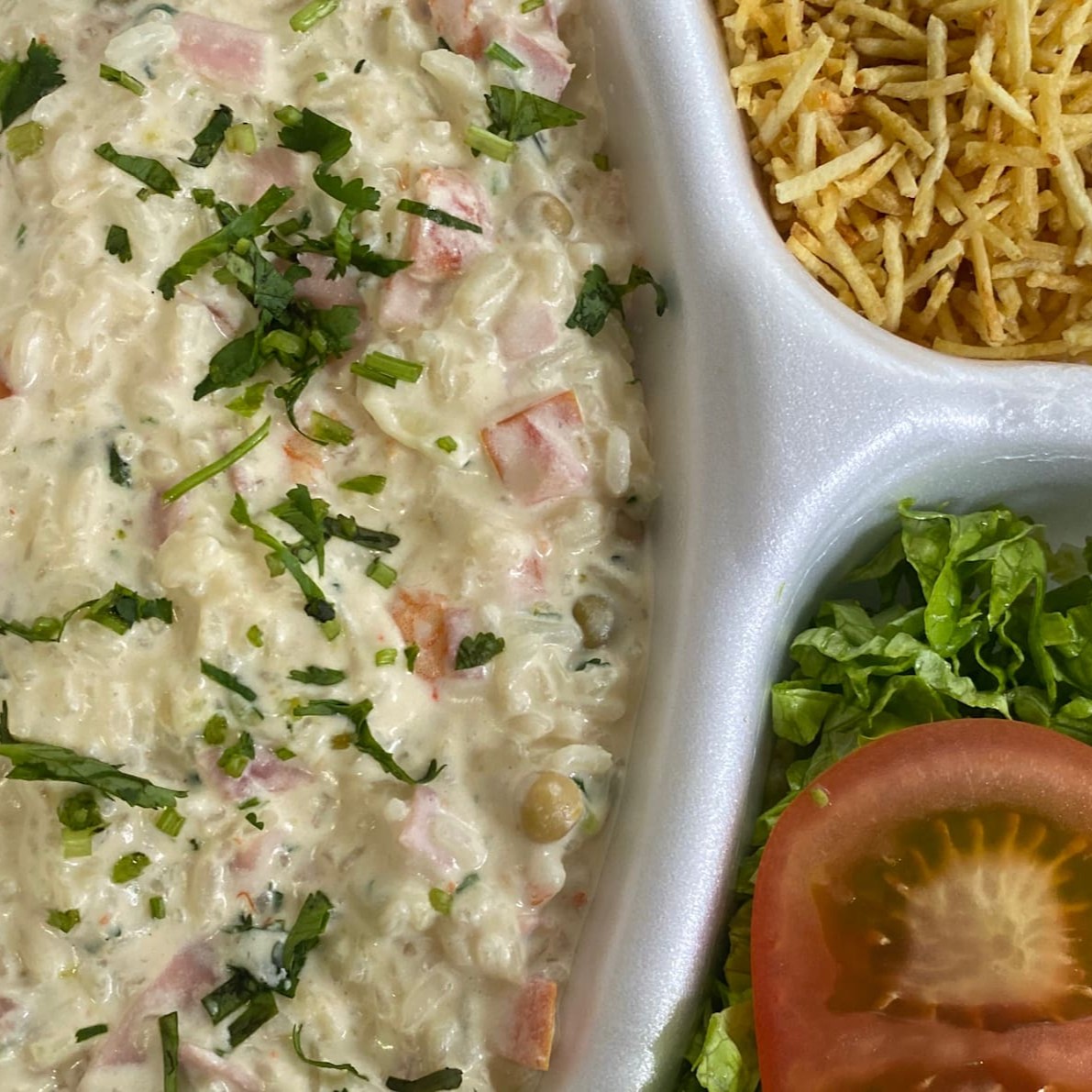 Arroz cremoso com ervilhas, presunto, queijo e batata palha.
