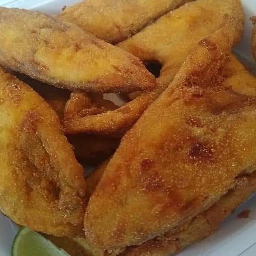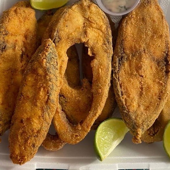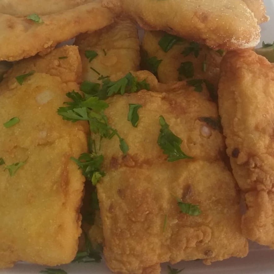 Porção de corvina com 8 postas com três acompanhamentos arroz, pirao e salada verde.